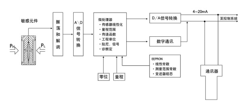 差壓變送器的核心是一個電容式傳感器,稱為“S”室。傳感器是一個完全密封的組件,過程壓力通過隔離膜片和灌充液硅油傳到傳感膜片引起位移。傳感膜片和兩電容極板之間的電容差由電子部件轉(zhuǎn)換成4~20mADC的二線制輸出的電信號。